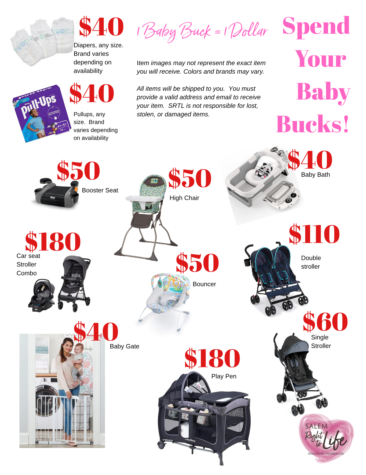 Participants can earn essential items from our catalog including diapers, wipes, carseats, strollers and cribs.